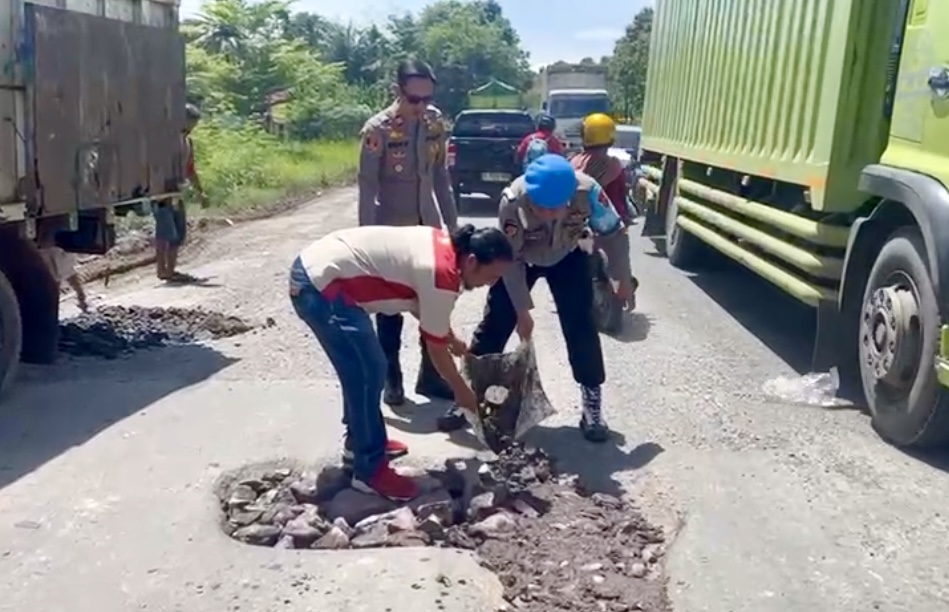 Di bawah terik matahari, seluruh pihak turun langsung memperbaiki jalan yang selama ini dikeluhkan masyarakat karena membahayakan para pengendara.