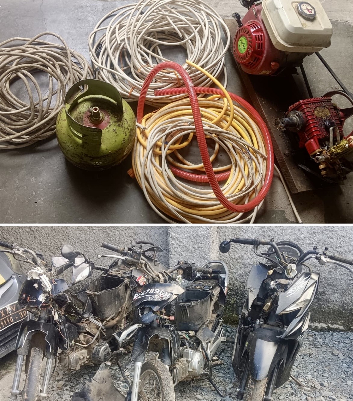 • 3 unit sepeda motor (Honda Beat, Honda Karisma, dan Honda Supra) dalam kondisi rusak, yang diduga digunakan para pelaku untuk melakukan aksi pencurian. Saat ini, pelaku dan barang bukti telah diamankan di Mapolsek Terbanggi Besar untuk pengembangan lebih lanjut. Kapolsek menjelaskan, berdasarkan hasil pemeriksaan terhadap NE alias Akbar, diketahui bahwa pelaku beraksi bersama 3 rekannya yang kini masuk dalam daftar pencarian orang (DPO), yakni BH, NO, dan RN. Atas perbuatannya, pelaku dijerat dengan pasal 363 KUHPidana, ancaman hukuman selama 7 tahun penjara. Kapolsek mengatakan bahwa pihaknya akan terus melakukan pengejaran terhadap ketiga pelaku lainnya dan berharap kerja sama dari masyarakat apabila memiliki informasi terkait keberadaan mereka. "Kami pun mengimbau masyarakat untuk tetap waspada dan segera melapor ke pihak berwajib jika mengetahui adanya aktivitas mencurigakan di lingkungan masing-masing," pungkasnya. (Humas LT)