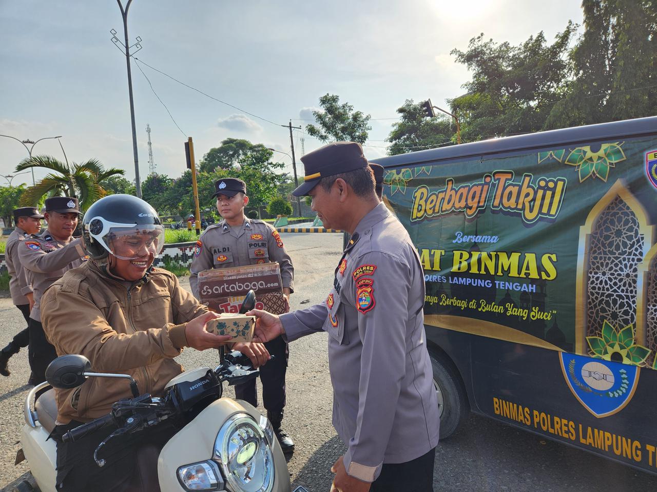 Seperti yang dilaksanakan pada Sabtu sore (21/2/26), Sat Binmas Polres Lampung Tengah membagikan sebanyak 350 paket takjil kepada para pengendara R2 maupun R4 yang melintas di Jalan Lintas Sumatera, tepatnya di Simpang Tugu Pepadun, Gunung Sugih, Lampung Tengah.